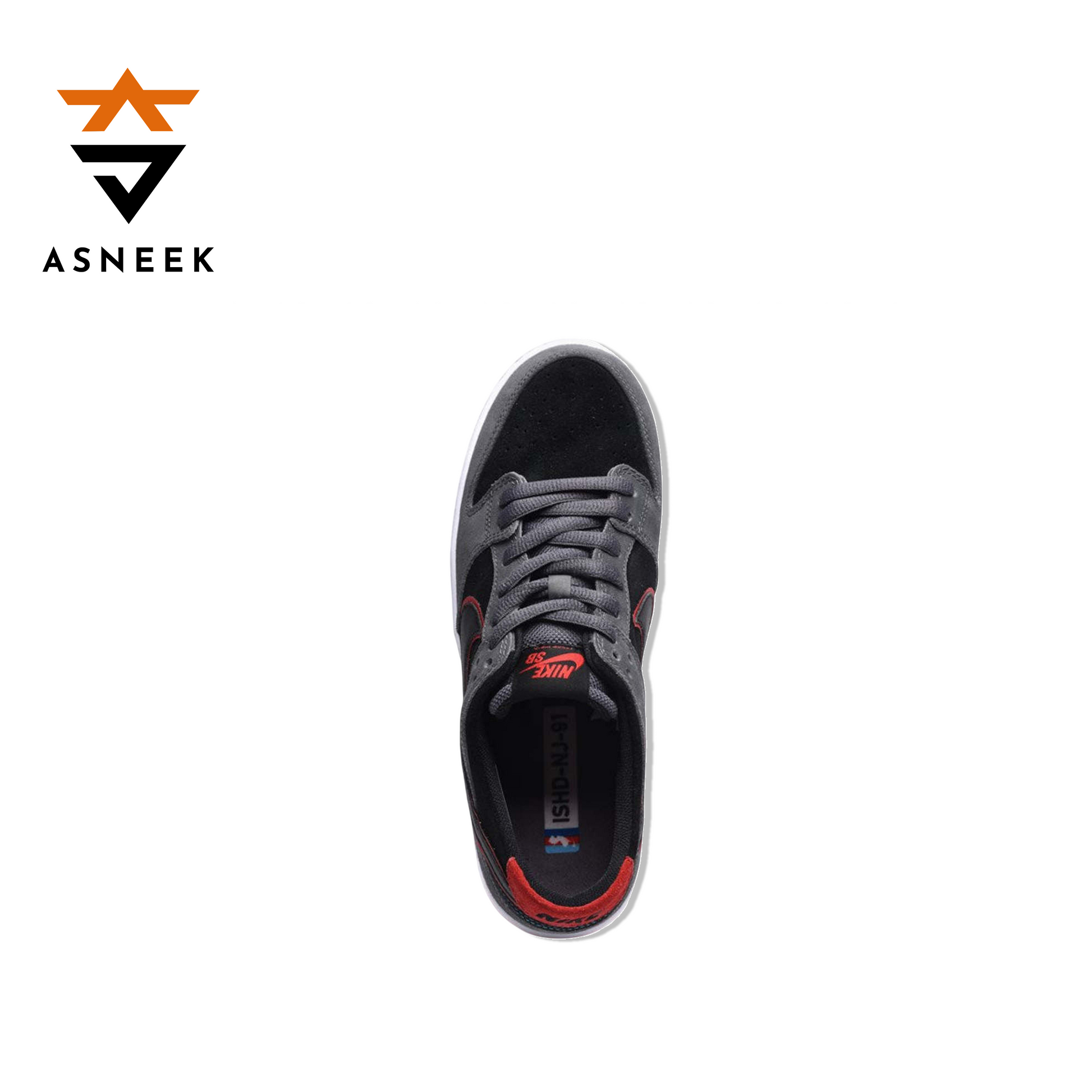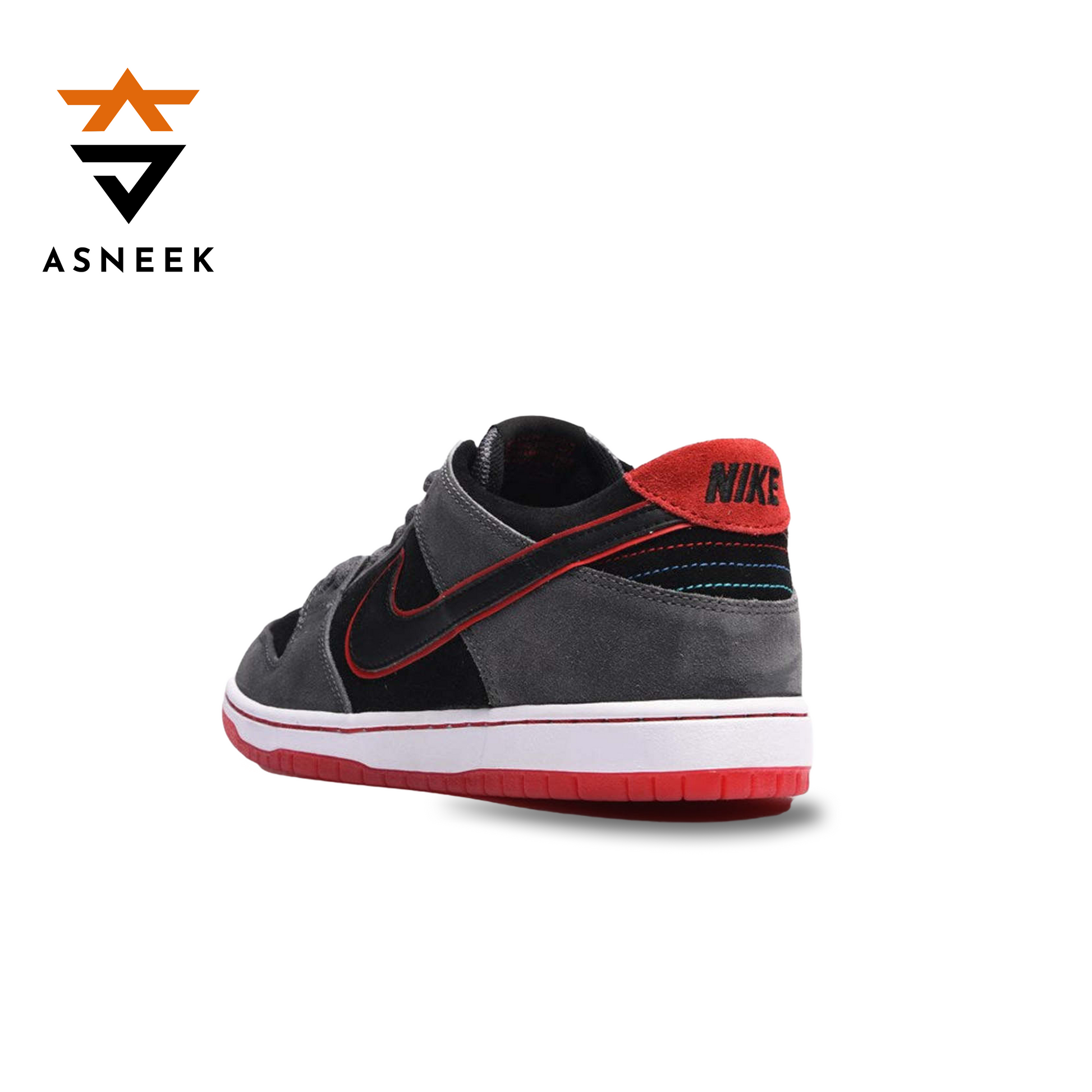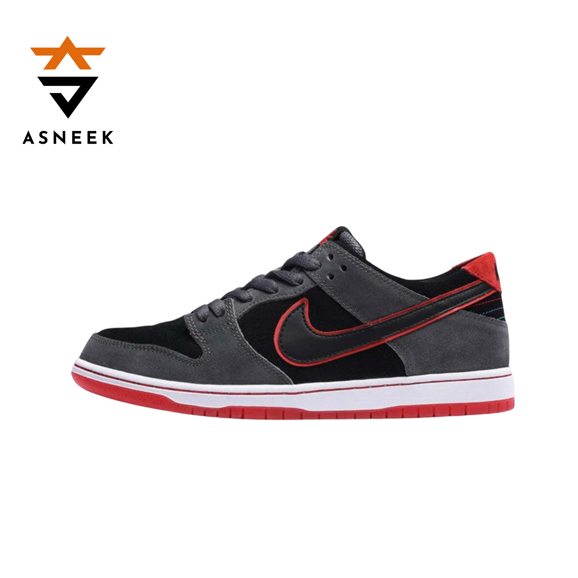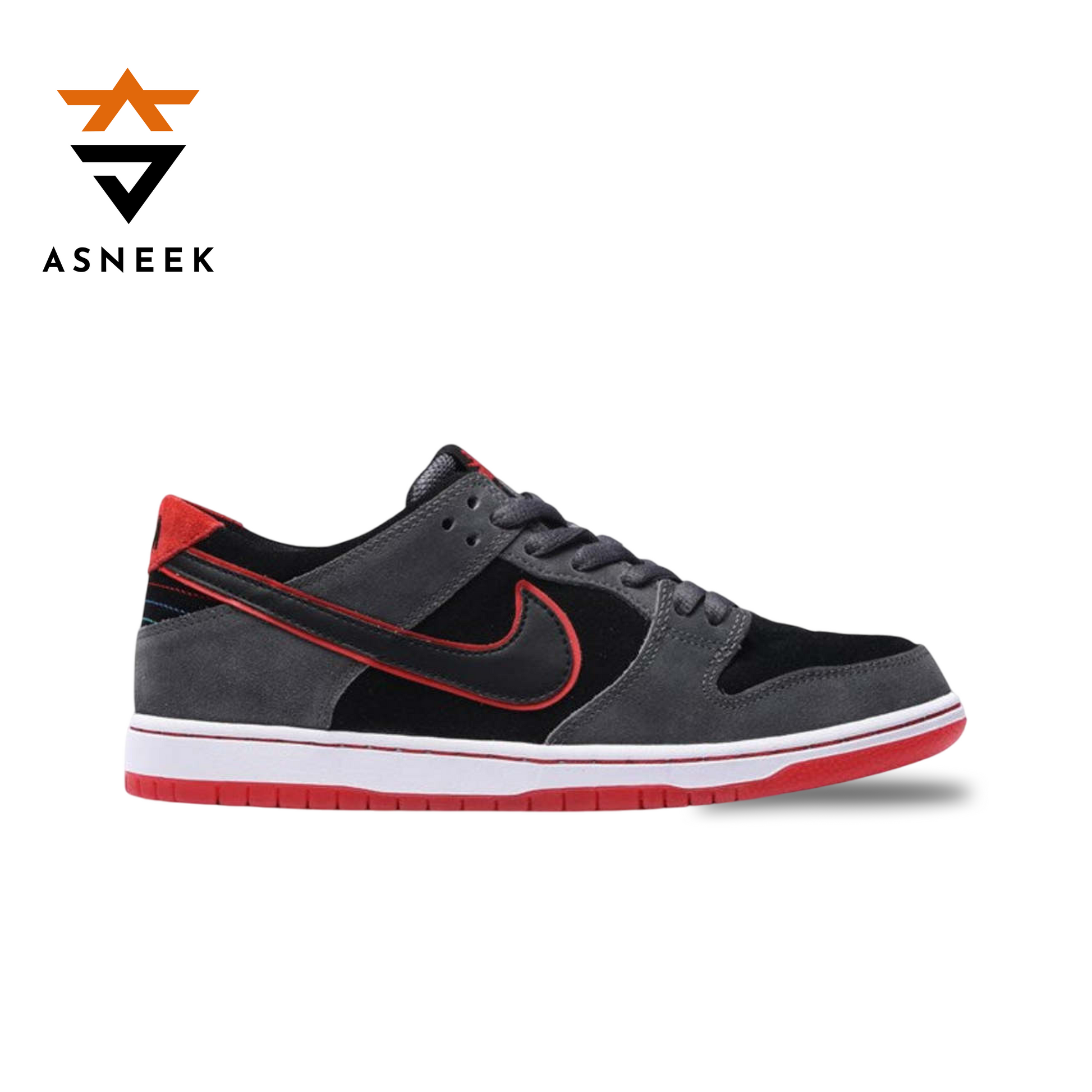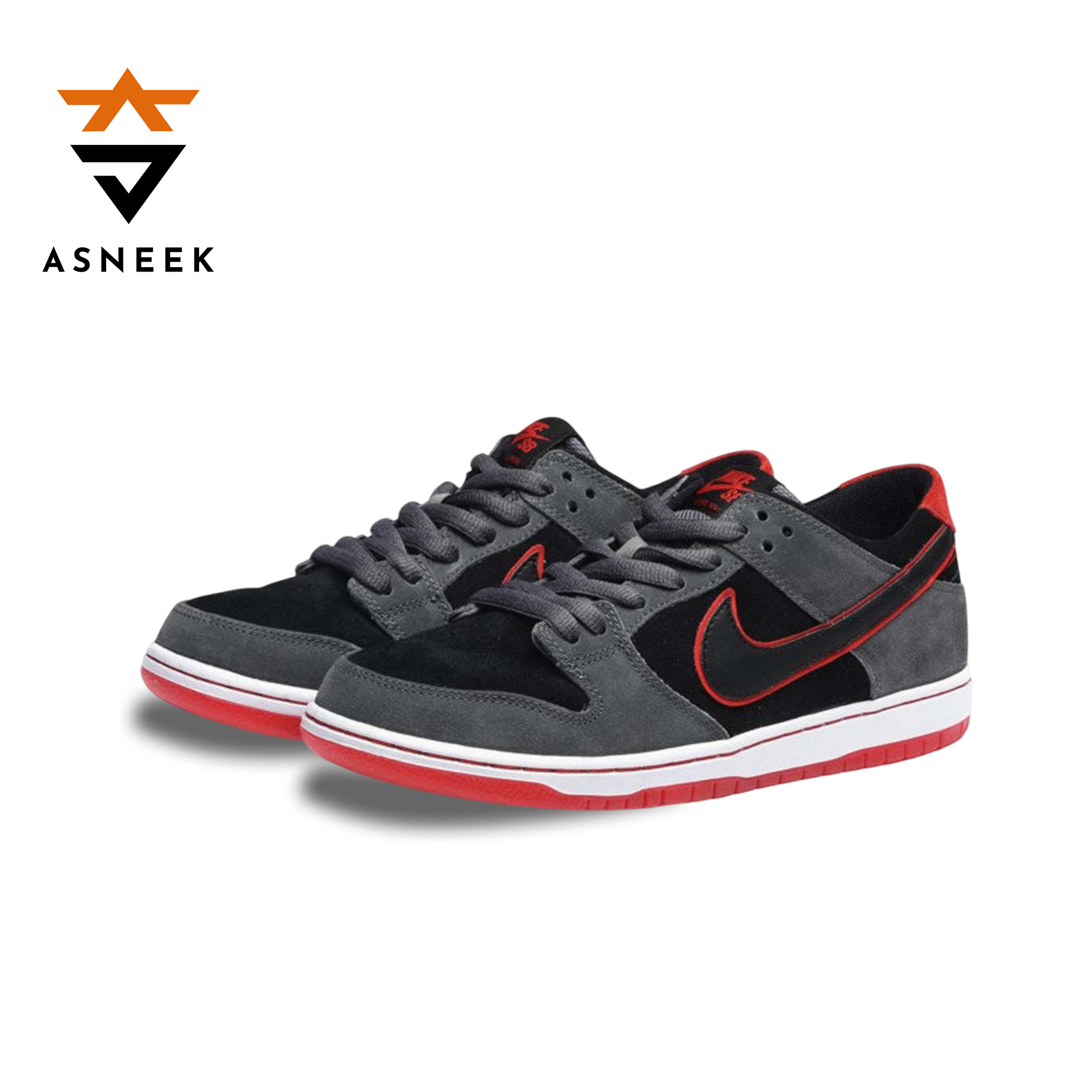 The Nike SB Dunk Low Pro in grey, black, and red is a classic skate shoe with a sleek and stylish design. It features a durable suede upper with a grey base, black overlays, and red accents on the Swoosh logo, tongue label, and heel tab. The shoe also includes a padded tongue and collar for comfort, as well as a vulcanized rubber outsole for excellent grip and board feel.